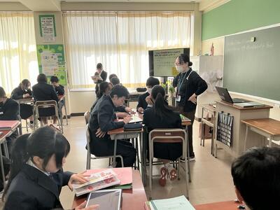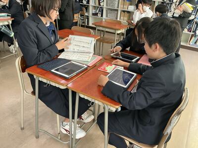 1年生の英語では、「日本の有名人を紹介しよう」をテーマにタブレットを用いて学び合いが行われていました。伝えたいことを、調べたり、訊きあったり、時にはAIに訊ねたりと様々でしたが、夢中に取り組む姿は素晴らしいです。