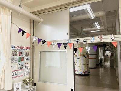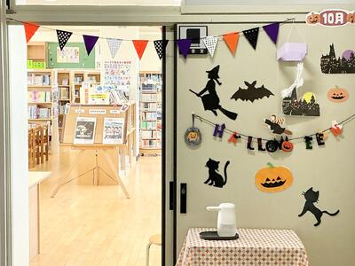 いつもすてきな季節の装飾で、生徒も楽しみにしている図書室の入口の装飾がハロウィンとなりました。イチョウの飾付けもあり、季節の雰囲気を味わうことができています。