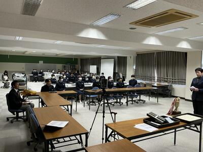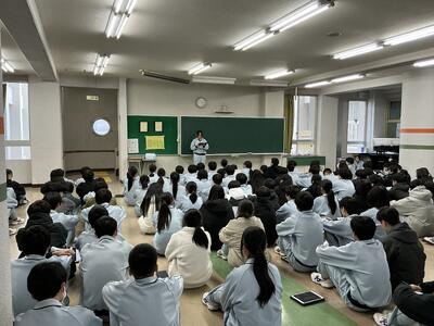 各学年の多目的ホールでは学年集会が行われました。後期前半の学校生活を振り返り、各クラスの代表が発表を行いました。普段の生活や合唱コンクールなどの行事を通してクラスの団結と成長が感じられたようです。