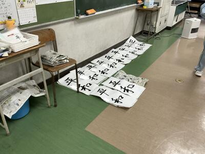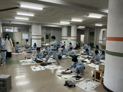 一年生の書き初めの課題は『平和』です。書に集中して作品を完成させていました。