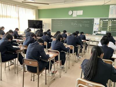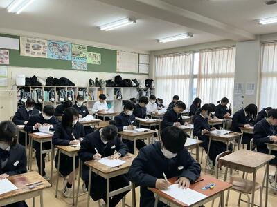 期末考査2日目を迎えました。「始めてください」の合図とともに取りかかる様子は気合いを感じます。そして1問1問集中して問題に向き合う姿は真剣そのものでした。2日間よく頑張りました。