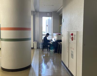 2階の多目的ホールでは美術の作品や家庭科の作品が展示されています。リニューアルした作品ではすてきな自画像と巾着袋が紹介されており、思わず立ち止まって見とれてしまいます。