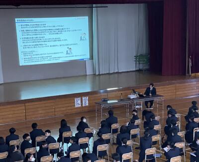 今日は、2学年PTA行事『高校の先生の話を聞く会』が開かれました。事前アンケートで希望の多かった高校の先生方に実際に来校していただき、学校の特色や2年生のうちに準備しておくこと等を知ることができました。生徒も保護者の方々も真剣に聞き入っていました。