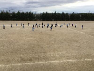 感染症対策を講じ,校庭でクラス合唱を行っています。