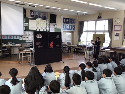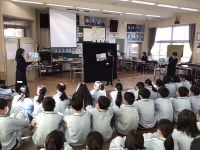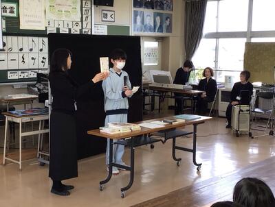 「本に親しむ会」が行われました。地域で読み聞かせ活動を行っている、しゃぼん玉の皆様をお迎えし、すてきな朗読を聴かせていただきました。音楽や寸劇も交えた朗読は迫力があり感動的でした。また、本の紹介では代表生徒が発表する場面もありました。