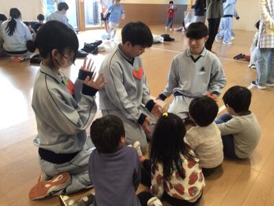 秋に実施予定だった幼稚園交流が、実施されました。家庭科の時間に製作した手作り絵本と、創作おもちゃを持って、学区内の幼稚園に出かけました。