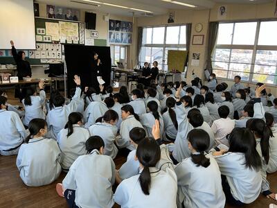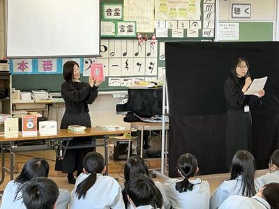 今日は1学年で、本に親しむ会が開かれました。市内で活動している、しゃぼん玉の皆様をお迎えして、素敵な本の紹介をしていただきました。寸劇あり、音楽ありの朗読にはわくわくさせられました。