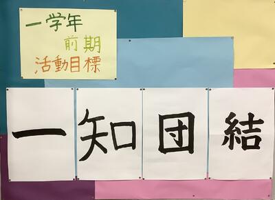 1学年のフロアーに掲げられた目標は一知団結。しっかりと頑張っています。