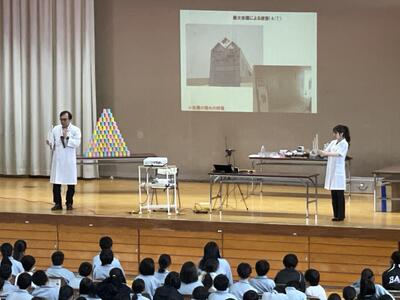 1学年では、『防災サイエンスショー』と題して防災学習が行われました。途中実験を交えながら日常からの備えや、災害時に気を付けることを学びました。