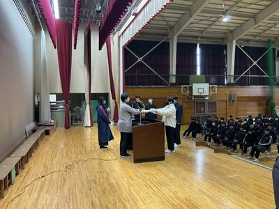 同窓会入会式が行われました。40年の歴史と伝統を受け継ぎ、これからも東向中を支えていくことを決意し宣誓しました。各クラスの代表生徒が同窓会会長より委嘱状を受け取りました。