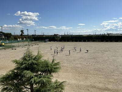 昼休みの校庭開放日は学年毎に決まっています。本日もたくさんの生徒がみんなで仲良くボール遊びを楽しんでいました。