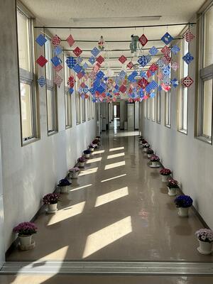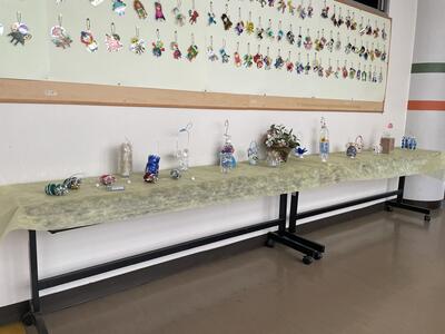 校舎にはいたる所にアート作品が展示されています。現在はプラ板アートと、切子作品が飾られています。通るたびに心躍ります。