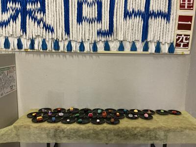 先日見つけた美味しそうな和菓子が、さらに増えました。美術の授業で作成した銘々皿の作品が出揃い、和菓子の作品とともに2階ホールに展示されています。
