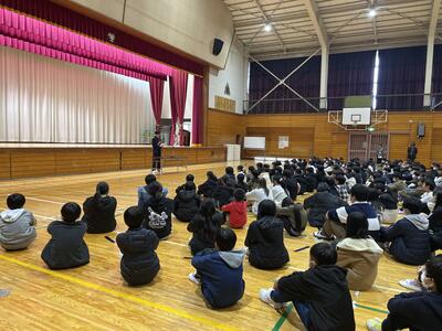 全体会では、生徒会代表が歓迎の言葉を伝え、中学校生活について話をしました。