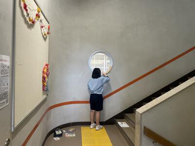 放課後の廊下では壁に何かを描いている生徒がいました。よく見ると丸窓の縁にデザインを施していました。どんな作品が出来上がるのか楽しみです。