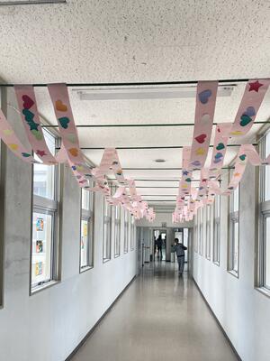 体育館通路にも新しい作品が登場しました。アートランタンを飾り付けたバーを利用して飾り付けた紙の帯で、すてきな空間が完成しました。