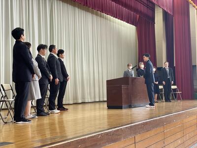 着任式では新しく着任された先生方を全校生徒でお迎えしました。代表生徒が歓迎の言葉を伝えた後、先生方より挨拶を頂きました。