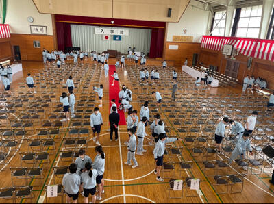 学級開きが終わると、明日の入学式に向けての準備が始まりました。2年生は公民館より椅子運びをした後、教室の飾り付けや校舎内の清掃をしました。