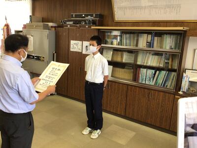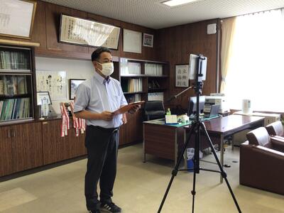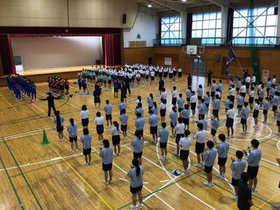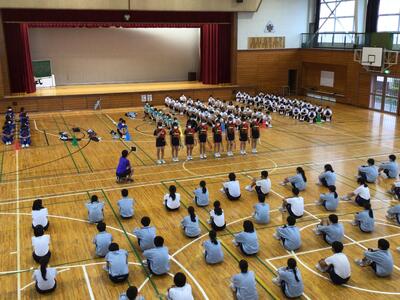 感染症対策のため,体育館で直接激励できたのは3年生だけですが,残りの学年は教室でリモートの画面越しに精一杯の激励を行いました。