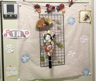 今月のテーマはお正月です。図書室前にはすてきな羽子板が飾られていました。