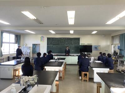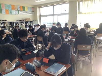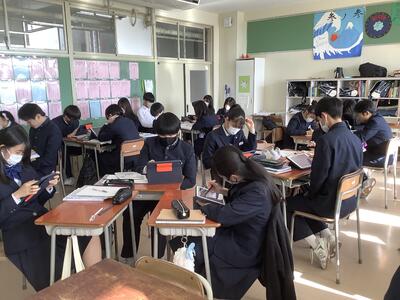 3年生では、現在、私立高校の出願が始まっています。そんな中、今日は推薦入試に臨む生徒が集まり、学校長より話を聴きました。緊張した雰囲気の中、真剣な態度が印象的でした。