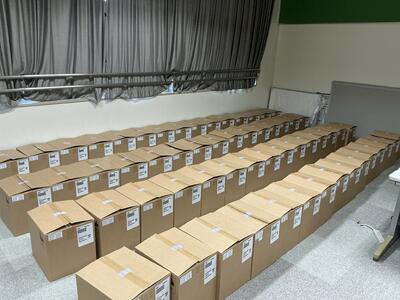 届いたのは大量の段ボール箱でした。GIGAスクール構想が始まってから早くも4年が経ち、授業や活動の中ではなくてはならない道具となったタブレットが、新端末に更新されることになりました。学びの道具として大切に使っていきましょう。