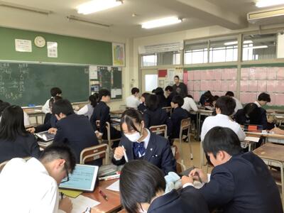 先週から二者面談が始まり、3年生は進路選択の大切な時期を迎えています。今日は学年で受験の際の面接について、動画教材を見ながら確認をしました。しっかりとポイントを知ることができました。真剣さを感じる時間となりました。