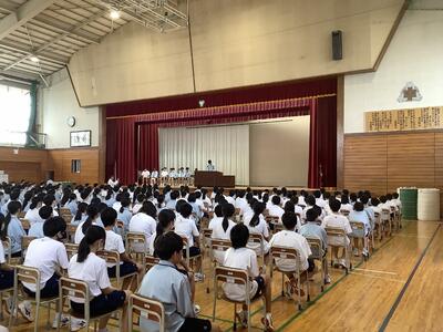 9/30、10/1に行われた新人大会では、各競技ともに熱戦が繰り広げられました。表彰式ではたくさんの賞状の表彰がありました。誇らしげな表情がほほえましく感じました。その後各部長から大会結果の報告があり、応援をしてくれた全校生徒への感謝を伝えていました。ブロック大会、県大会と次の戦いに向けても頑張ってほしいと思います。