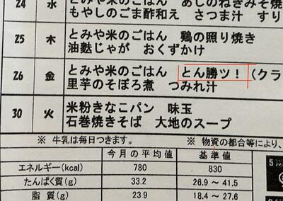 毎日の美味しい給食に感謝です。今日のメニューは大人気のトンカツでした。しかし、大事件が、、、。なんとメニューに「とん勝っ」とありました。給食センターの方々の粋なはからいに、嬉しさ倍増でした。
