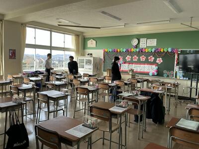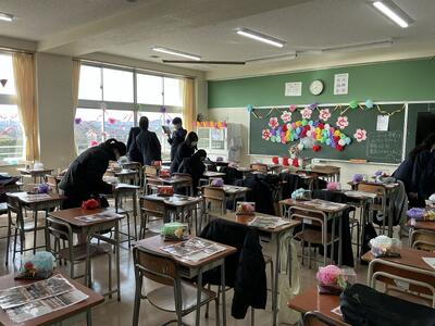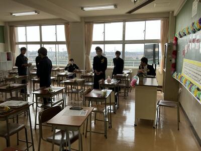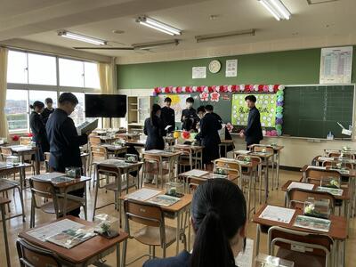 教室では2年生の代表生徒が3年生を出迎えていました。3年生はちょっぴり緊張しながらも、友達と和やかに話をする姿が見られました。