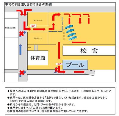 熊の目撃情報が多発し、大きな地震が発生するリスクも考えられます。本校では、緊急時を想定し、車での引き渡しをする際の動線を次の図のように考えています。安全で迅速に引き渡しができるよう、保護者、地域のみなさまのご理解とご協力をお願いします。