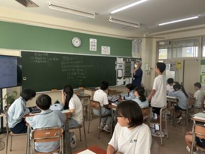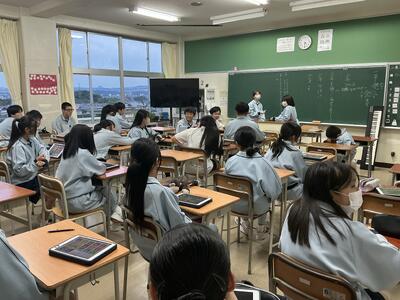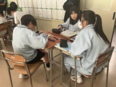 1年生の英語では、「日本の有名人を紹介しよう」をテーマにタブレットを用いて学び合いが行われていました。伝えたいことを、調べたり、訊きあったり、時にはAIに訊ねたりと様々でしたが、夢中に取り組む姿は素晴らしいです。