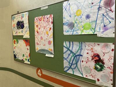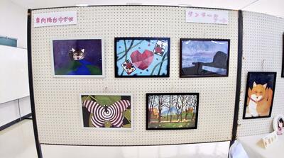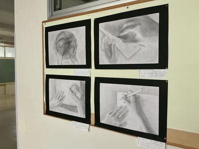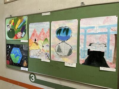 美術の授業等で作成した絵画作品の展示が始まりました。多目的ホールや階段にはすてきな作品が飾られています。足を止めて見入る生徒も多いです。